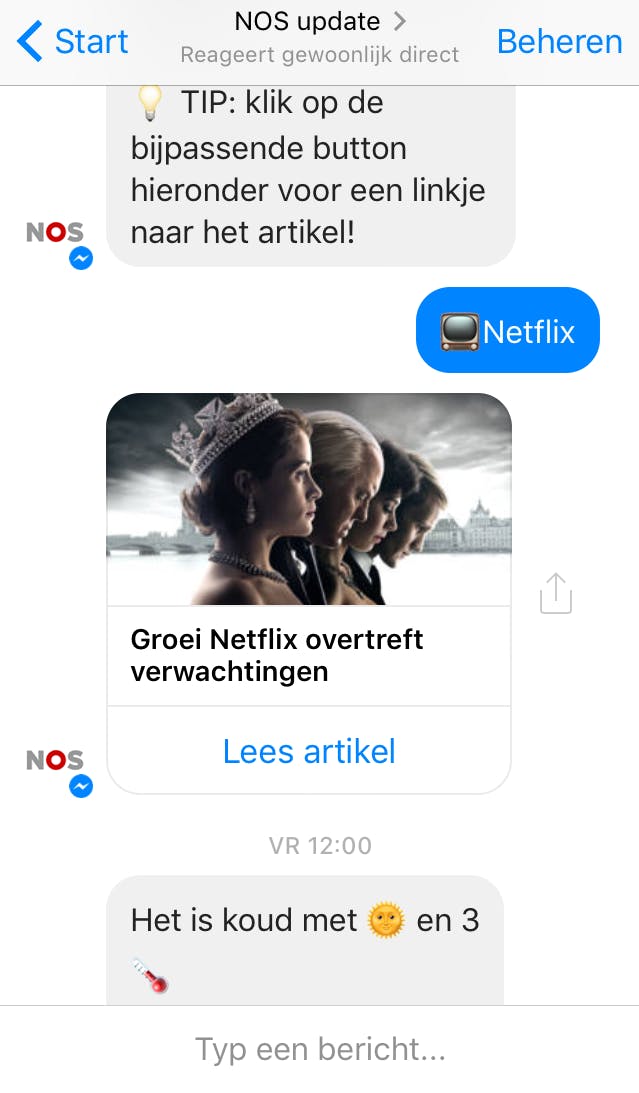 Sinds het voorjaar van 2016 laat Facebook chatbots toe op zijn Messenger-platform. Je kunt ze zowel op pc, Android als iOS gebruiken, al maakt de app niet direct duidelijk hoe je een conversatie met een chatbot start. Een goed startpunt om het aanbod door te spitten, is Botlist. Hier vind je bijvoorbeeld chatbots van eBay, Spotify en Nike en zie je ook wat je ermee kunt en hoe je ze instelt. Weet je precies wat je wilt, dan kun je ook in Facebook Messenger zelf zoeken. Tik bovenin de zoekbalk ‘NOS Update’ en vervolgens op de knop Aan de slag om een gesprek te starten. Met NOS Update krijg je elke dag automatisch een samenvatting van het belangrijkste nieuws. Ook kan de chatbot het laatste nieuws tonen over thema’s als politiek, sport of het weer. Echt slim is NOS Update niet: de bot kent maar een paar zinnetjes en kan geen langere vragen beantwoorden.