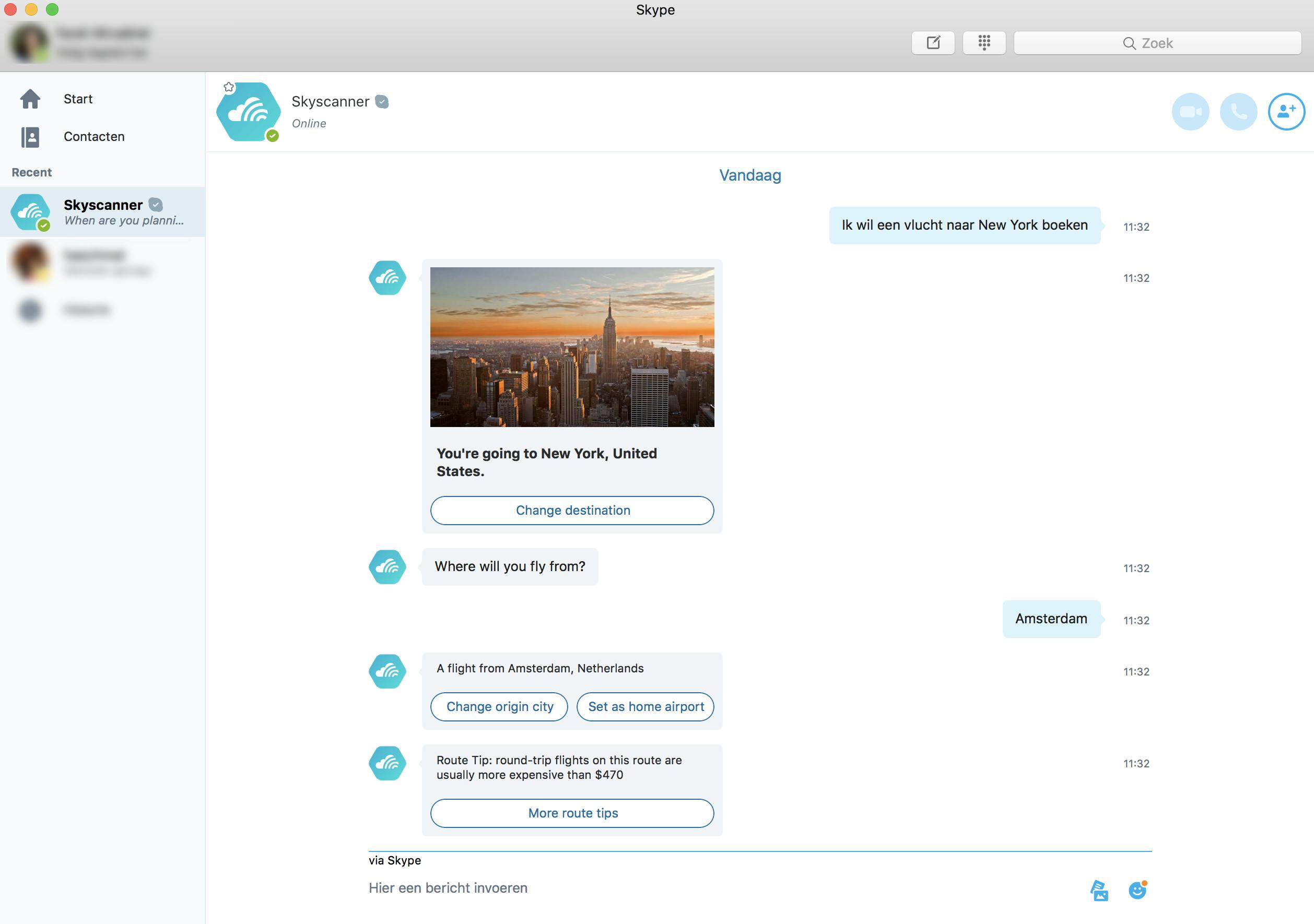 Het voordeel van chatbots ten opzichte van apps, is dat je ze met één klik kunt openen. Zo ook in Skype. Op Windows klik je binnen Skype op de knop Bot toevoegen, op Mac ga je naar Contacten / Bot toevoegen en op een soortgelijke manier kun je in de Android- en iOS-app op zoek naar een gespreksmaatje. Vervolgens lees je meer over de bot, welke mogelijkheden hij heeft en hoe de bot omgaat met je privacy. Klik op Voeg toe aan contacten en het gesprek kan beginnen. Veel Skype-bots zijn Engelstalig. Zo kun je met de Skyscanner-chatbot weliswaar in het Nederlands een vliegticket zoeken, maar om daadwerkelijk te boeken moet je op een gegeven moment toch echt op het Engels overschakelen. Ook zijn er enkele op tekst gebaseerde games, die alleen in de Engelse taal speelbaar zijn. De interessantste bot is nog wel de Skype-bot van IFTTT, waarmee je ‘recepten’ maakt om apps, apparaten en websites met elkaar te verbinden. Zo kun je herinneringen krijgen van afspraken of evenementen uit je Google Agenda of Office 365 Agenda, of een geautomatiseerd bericht naar collega’s sturen als je het kantoor verlaat. Meer mogelijkheden vind je hier.