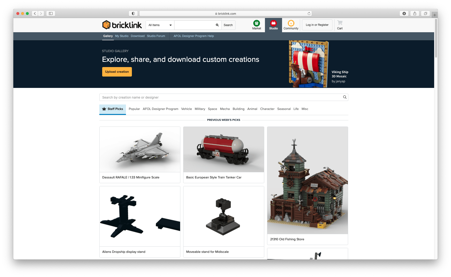 Als je Studio opent, word je verwelkomd door een opstartscherm van waaruit je een nieuwe creatie kunt maken of een bestaande kunt openen. Laten we eerst eens een bestaand model van een AFOL openen. Onder Recent creations vind je er al een paar, maar je kunt ook links op Gallery klikken. De website van BrickLink wordt geopend, zoek daar naar een model of gebruik één van de categorieën bovenin. Zorg dat je Downloadable achter Show selecteert. Klik op een model en kies op de volgende pagina voor Download Studio file.