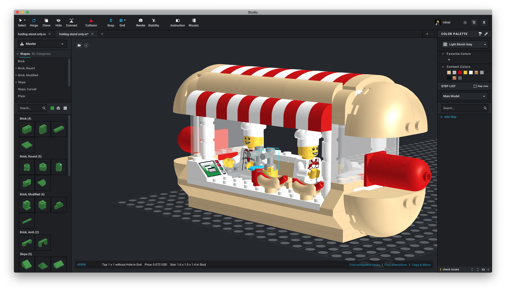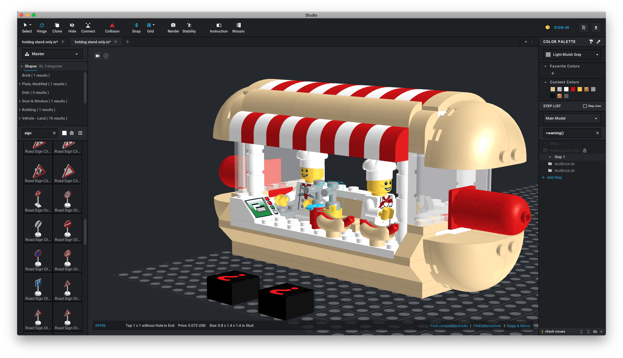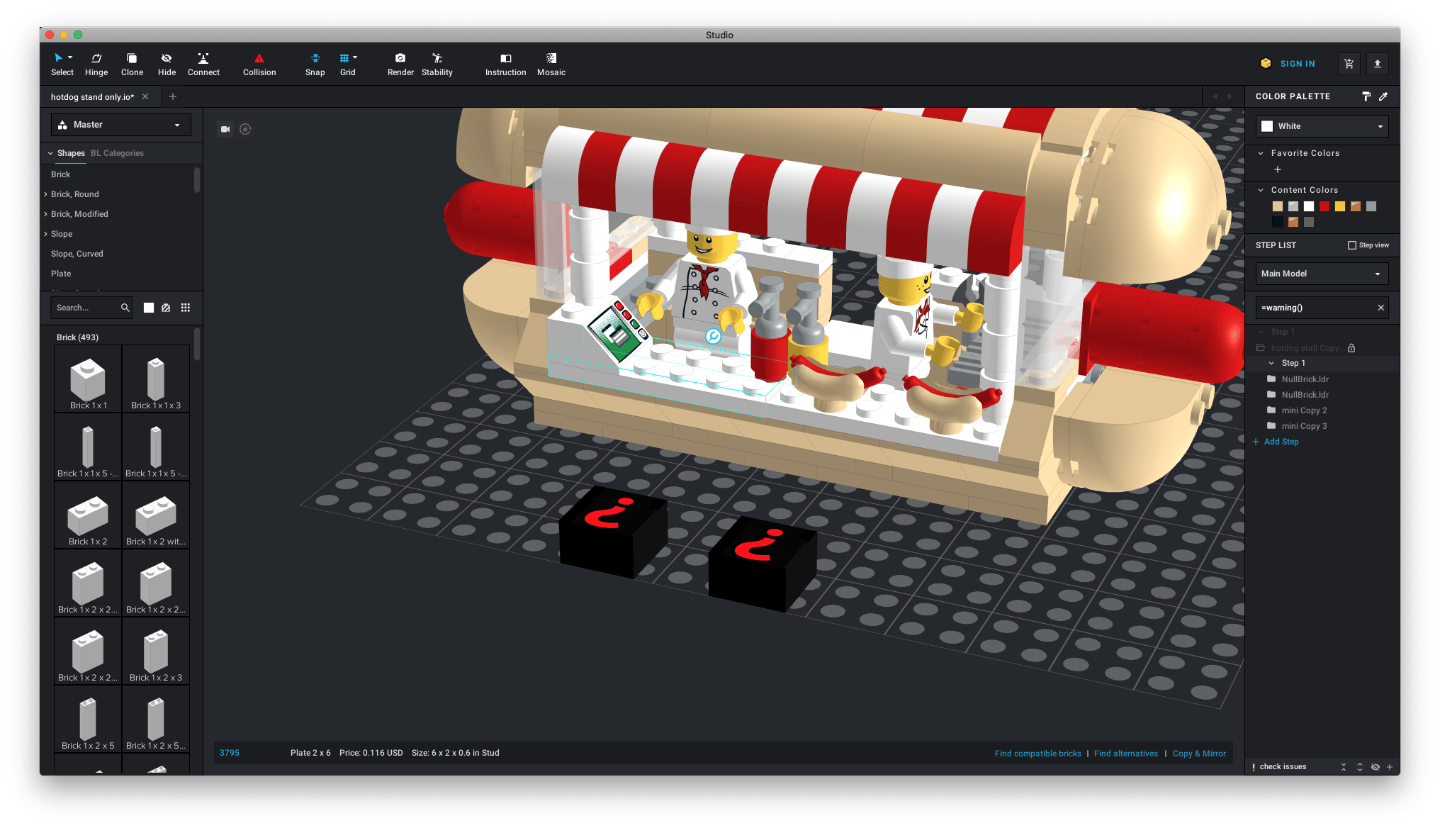 Het kan zijn dat je in een model geen losse steentjes kunt selecteren. In dat geval heeft de ontwerper steentjes gegroepeerd. Om dit ongedaan te maken, klik je rechts onder Step list op de map waar alle steentjes inzitten en klik je op het slotje. Zorg dat je links bovenin Select hebt geselecteerd en klik op een steentje in het model. Links onderin zie je nu de officiële LEGO-code van het steentje. Ernaast zie je de naam van het element, de gemiddelde prijs van het steentje op BrickLink in nieuwstaat en de grootte in studs (noppen).