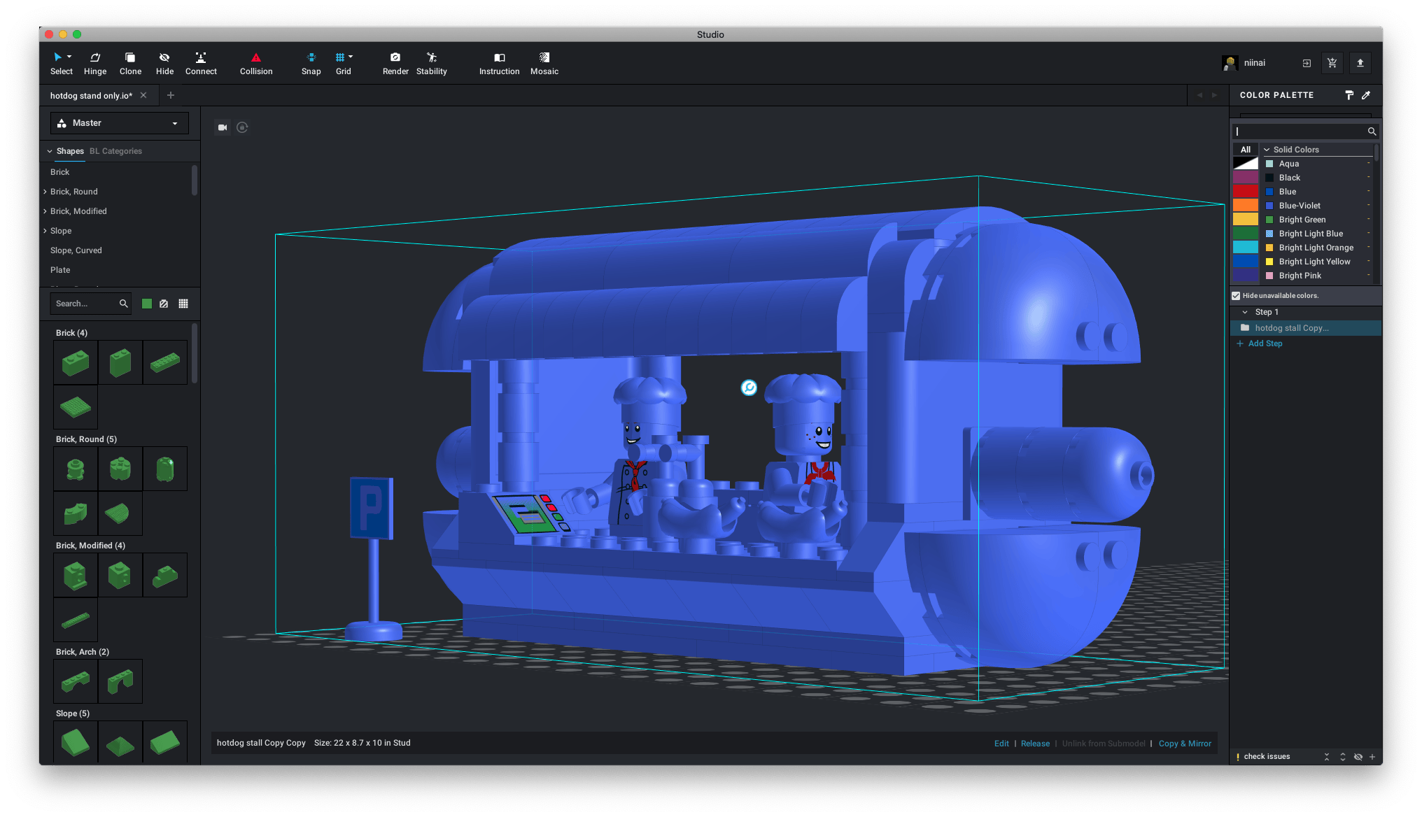Om het bestand te kunnen downloaden, meld je je eerst gratis aan bij BrickLink. Klik op Create account en volg de instructies of voer je gebruikersnaam en wachtwoord in als je al een account hebt. Open het bestand vervolgens in Studio. Als je je rechtermuisknop ingedrukt houdt en met je muis beweegt, kun je het model vanuit verschillende hoeken bekijken. Met je linkermuisknop kun je onderdelen selecteren. Bovenin vind je het belangrijkste menu en aan de linkerkant de bibliotheek met steentjes.