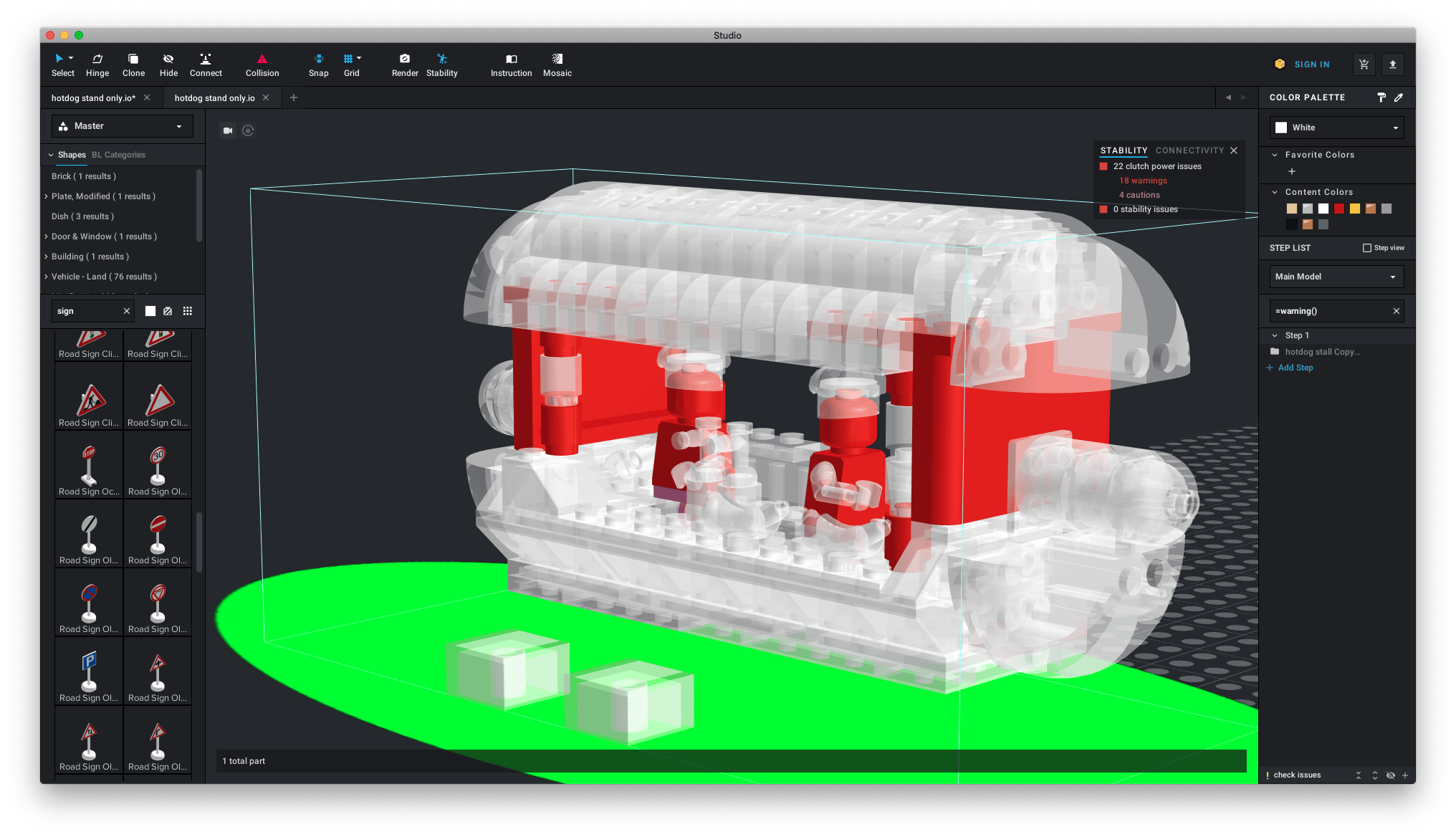 Als je weinig ervaring hebt met het daadwerkelijk bouwen van LEGO-modellen, dan is het lastig te zeggen of je model het in het echte leven goed zou doen. Studio heeft daarom een handige tool genaamd Stability. Je vindt het bovenin de menubalk. De functie maakt onderscheid tussen structurele problemen en zogenoemde clutch power issues. Een clutch power issue warning betekent dat je model op deze plekken het minst sterk is en je misschien iets moet doen om deze delen steviger te maken. Dit betekent overigens niet dat je model meteen in zal storten.
