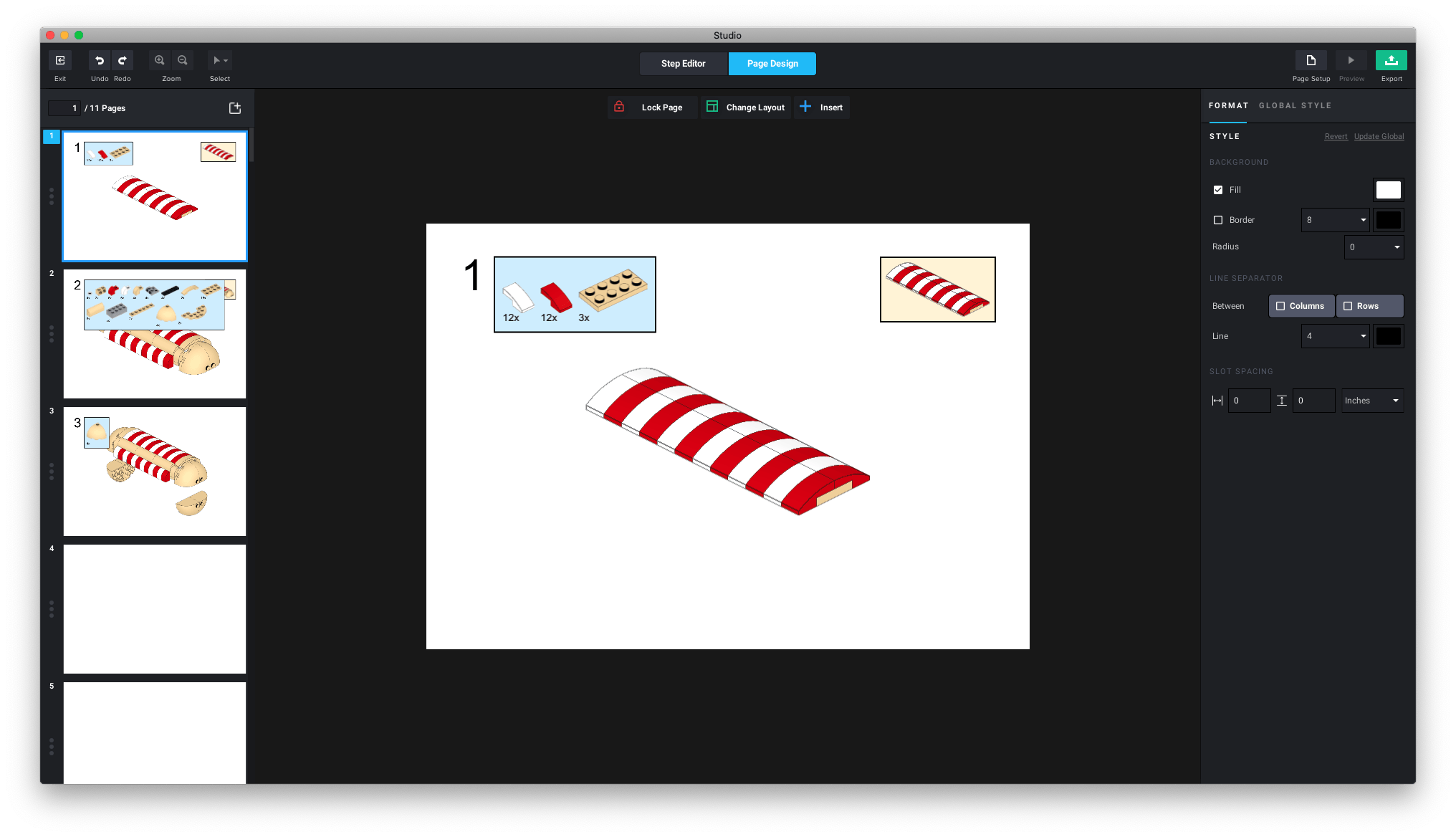 Ook belangrijk bij een LEGO-model zijn natuurlijk de bijbehorende instructies. Zorg eerst dat je je model hebt opgeslagen en klik dan bovenin op Instructions. In de Step editor zie je nu alle steentjes van je model onderin. Voeg bovenin extra stappen toe en sleep onderdelen uit je model naar de desbetreffende stap. Klaar? Klik dan bovenin op Page design om de verschillende elementen van je instructieboekje aan te passen. Klik op Export om je boekje als pdf-bestand op te slaan en dan op Exit om de instructiemodus te verlaten.