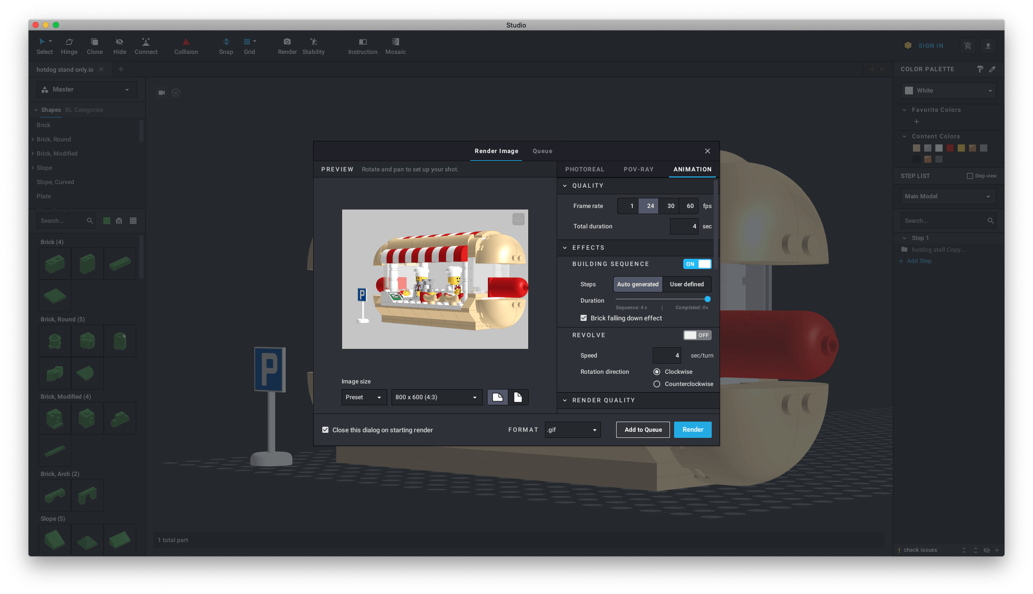 Tijdens het renderen gebruikt je pc even alle beschikbare cpu-kracht, andere programma´s kunnen daardoor trager worden. Op een apart schermpje zie je de voortgang. Je kunt zelfs een animatie van je bouwstappen maken met de render-engine in Studio. Hiervoor klik je op Render en kies je de optie Animation. Onder Effects kun je Building sequence aanzetten. Kies voor Auto generated en zet een vinkje voor Brick falling down effect. Het renderen van een animatie duurt erg wel lang, elke stap duurt net zo lang als één keer een normale render van je model.