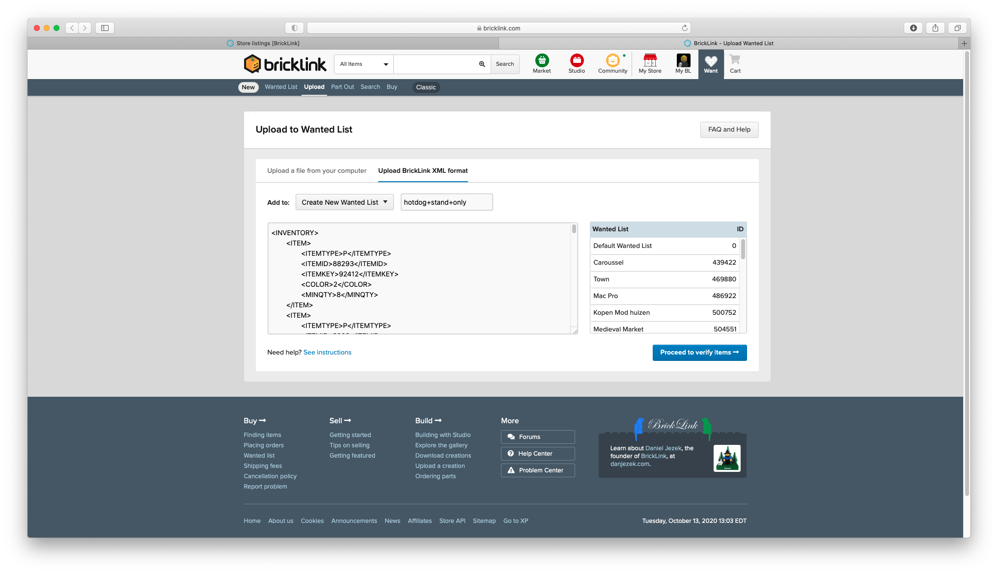 Het leukste is natuurlijk om de steentjes te bestellen. Dit kan bij online marktplaats BrickLink. Maak daarvoor eerst een account aan op www.bricklink.com. Klik daarna in Studio bovenin op Sign in. Omdat BrickLink uit een verzameling losse webwinkels in verschillende landen bestaat, werkt de site met zogenoemde wanted lists ofwel verlanglijstjes. Je kunt zien hoeveel steentjes een bepaalde shop van jouw verlanglijst op voorraad heeft. Om alle gebruikte steentjes in je project naar een verlanglijst te sturen, klik je bovenin op Add to Wanted List.
