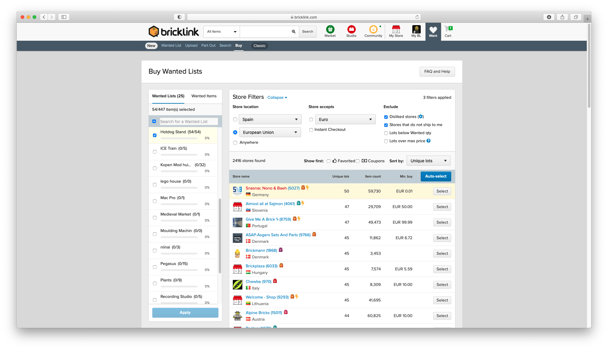 Klik op de groene knop Buy all en BrickLink gaat kijken welke winkel de meeste steentjes uit jouw verlanglijst op voorraad heeft. Bovenin filter je bijvoorbeeld op European Union om alleen winkels in de EU te zien. Nu kan het grote vergelijken beginnen: elke shop hanteert namelijk een andere prijs voor elk steentje in een andere kleur. Begin bij de bovenste winkel in de zoekresultaten en kijk wat de winkel vraagt per steentje in jouw verlanglijst door op Select te klikken. Je kunt eventueel bepaalde steentjes uitsluiten, deze blijven dan in je verlanglijst staan.