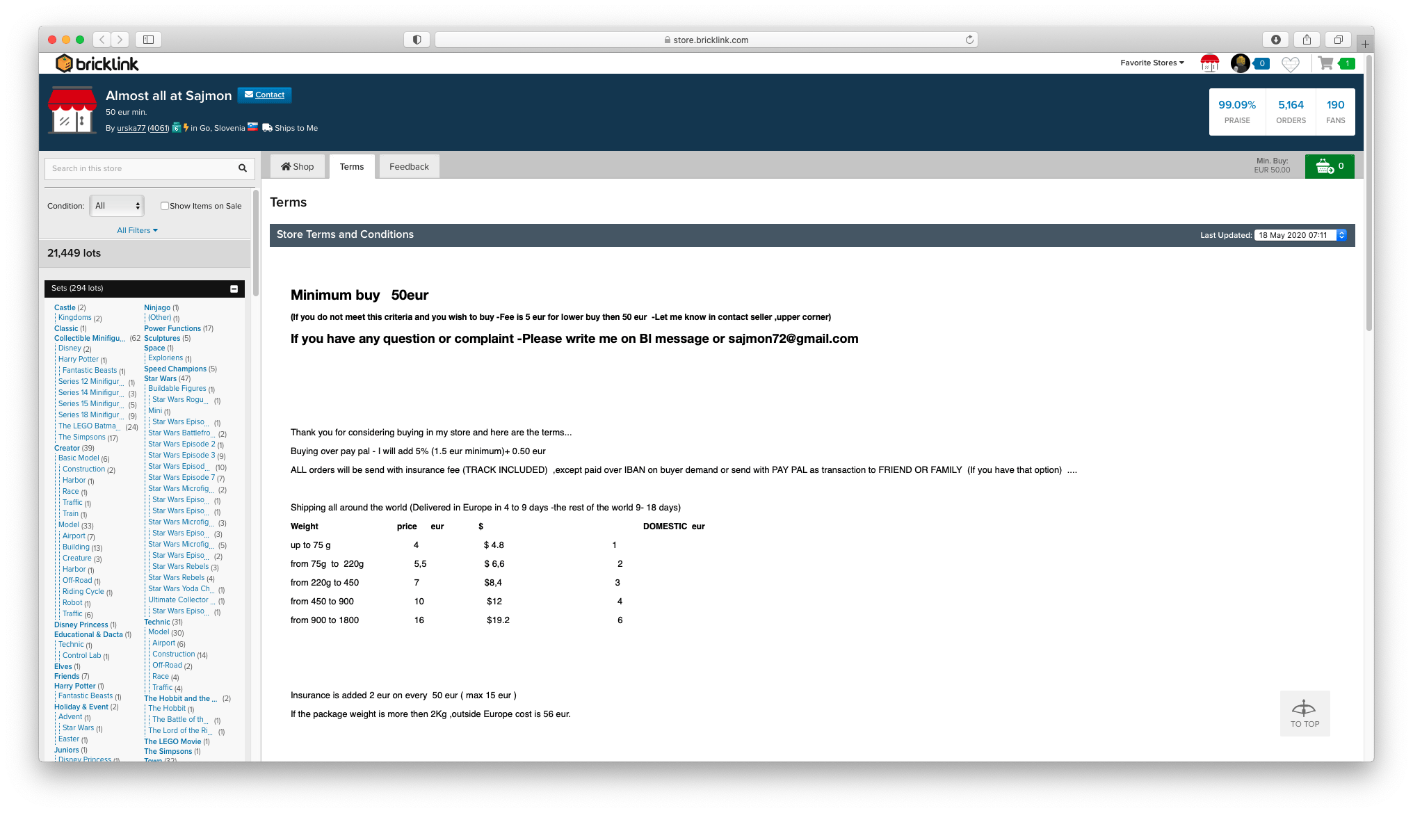 Klik op de naam van een winkel in de zoekresultaten om de voorwaarden van een winkel te zien. Belangrijk om te weten want sommige winkels berekenen hele hoge verzendkosten en anderen leveren bijvoorbeeld niet aan Nederland. Voeg nu je items toe aan het winkelwagentje van de desbetreffende shop en plaats je bestelling. Meestal hoef je pas te betalen als de winkel je een bericht heeft gestuurd dat ze de steentjes ook daadwerkelijk op voorraad hebben. Via de website van BrickLink kun je bijhouden wat de status van je bestelling is. Voor meer informatie over het bestelproces kijk je op www.bricklink.com/helpdesk.asp.