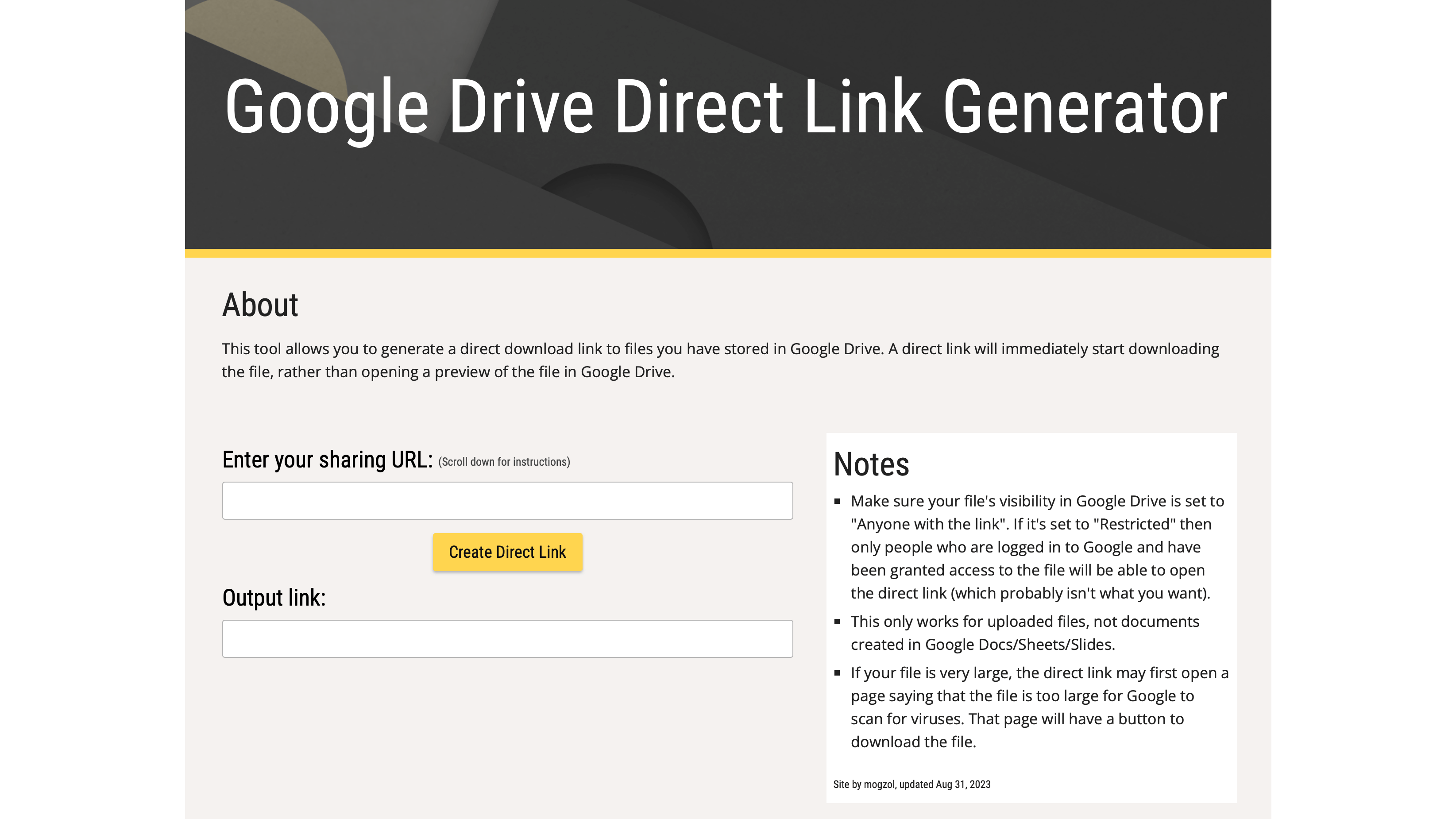 Vind je dit te veel gedoe en wil je de link niet handmatig wijzigen, dan kun je de online convertor Google Drive Direct Link Generator gebruiken. Om de link te converteren, moet je het volgende doen. Haal de link op zoals we in de eerste stap hebben beschreven. Je moet dus zorgen dat iedereen toegang heeft tot het bestand via de link. Daarna plak je deze link in het vak Enter your sharing url. Vervolgens klik je op de gele knop Create Direct Link. In het vak Output link verschijnt nu de koppeling die je nodig hebt.
