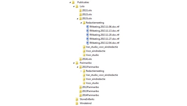 Hierdoor zal het systeem de bestanden met dezelfde naam steeds in de chronologisch volgorde plaatsen, zelfs wanneer je ze op naam rangschikt. Houd bestandsnamen zo kort mogelijk. De namen van mappen en bestanden moeten relevant zijn en voor alle medewerkers duidelijk zijn, ook voor nieuwkomers. Gebruik voldoende submappen om alles netjes uit te splitsen en begin nooit de map Allerlei of Algemeen. Zo'n map wordt binnen de kortste tijd een rommelhok.