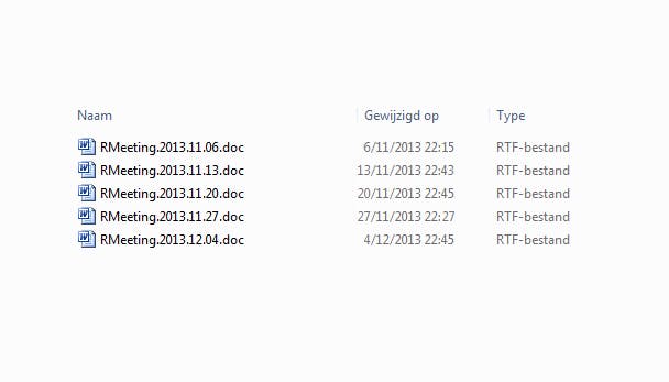Geef bestanden een naam die niet alleen betekenisvol is voor jezelf, maar ook voor de ontvanger en plaats eventueel een revisienummer achter de bestandsnaam. Startvergadering.v01.docx is een oudere versie dan Startvergadering.v02.docx. Voeg je datums toe aan een bestandsnaam, dan gebruik je het formaat jjjj-mm-dd of jjjj.mm.dd. Dit geeft voor een document van 1 mei 2014 iets in de aard van Rapport.2014.05.01.docx.