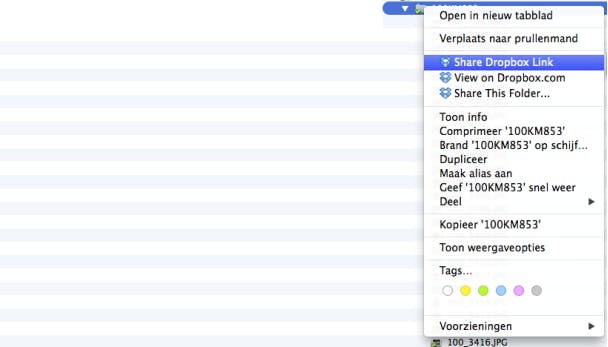 Ook via de website van Dropbox is dat mogelijk. Ga naar www.dropbox.com en zoek het bestand of de map. Klik met de rechtermuisknop en kies Share link.