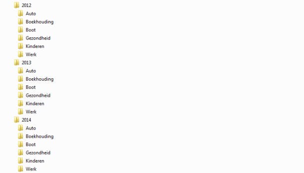 Veronderstel dat je voor je organisatie ieder jaar dezelfde mappenstructuur opbouwt. Je kunt in Windows gemakkelijk de volledige structuur van mappen en alle submappen zonder de bijbehorende bestanden dupliceren voor het jaar daarna. In dit voorbeeld willen we de structuur van de map 2013 overbrengen naar de map 2014. Eerst maak je een nieuwe lege map aan die je de naam 2014 geeft.