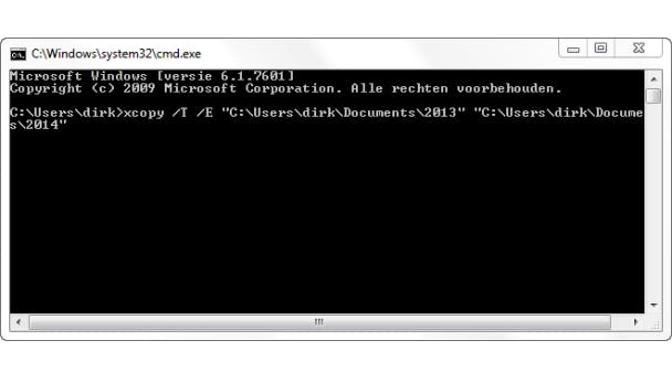 Daarna typ je in het zoekvak van Start cmd om de opdrachtprompt te openen. Daarna geef je het volgende commando in: xcopy /T /E "C:\Users\gebruikersnaam\Documents\2013" "C:\Users\gebruikersnaam\Documents\2014". Hierbij moet je uiteraard jouw eigen gebruikersnaam ingeven en de map waar de bestanden staan. Druk op Enter en je bent klaar.
