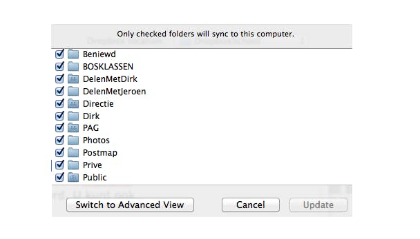 Daarna klik je op Advanced en kies je Selective Sync: Change Settings. Vervolgens krijg je een overzicht van alle mappen waartoe je met deze computer toegang hebt. Zet vinkjes voor de mappen waarmee deze pc de inhoud moet synchroniseren, en verwijder de vinkes voor de rest van de mappen. Zo laat je de familiefoto's wel synchroniseren tussen je laptop en desktop, maar krijg je ze niet te zien op de computer op je kantoor.