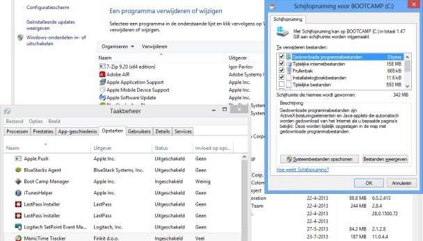 Verwijder tijdelijke bestanden door in het venster Uitvoeren de opdracht cleanmgr.exe te geven. Probeer ook een aantal programma's, die laden tijdens het opstarten, uit te schakelen via Taakbeheer. Druk op Ctrl+Shift+Esc en open het tabblad Opstarten. Selecteer een programma en druk op Uitschakelen.