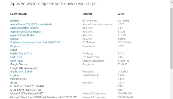 Na het vernieuwen van de pc wordt er een document met alle verwijderde programma's opgeslagen.