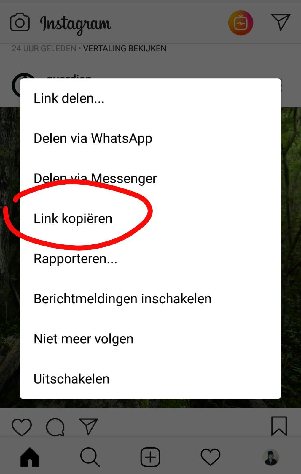 Kies de foto die je wil downloaden en selecteer de drie puntjes rechts naast de foto. Hiermee open je het menu. Kies voor Link kopiëren en de app zal er automatisch voor zorgen dat de foto in je galerij wordt opgeslagen.
