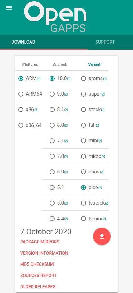 Waarschijnlijk wil je gewoon de apps van Google draaien op je Raspberry Pi met Android. Dat kan, maar vereist nog wat extra stappen. Bezoek eerst in de browser op Android deze website en selecteer daar als platform ARM, als Android-versie 10.0 en als variant pico. Dit is de minimale variant die je nodig hebt om Google Play te draaien. Download dit pakket dan, het is zo’n 90 MB groot.