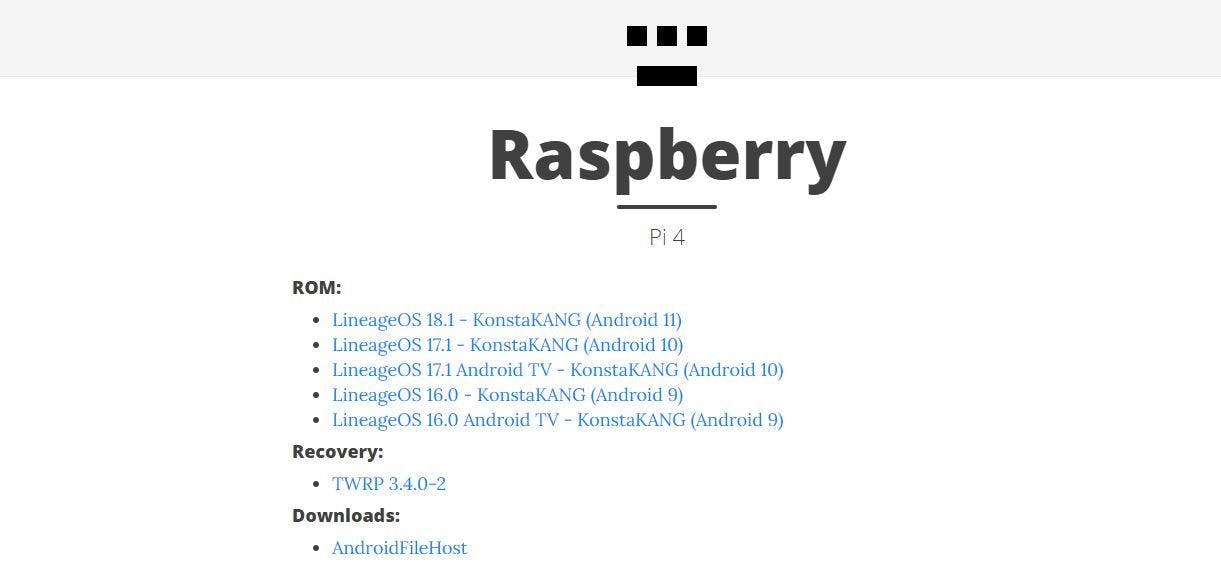 Als je Android op je Raspberry Pi wilt draaien, heb je een aangepaste versie van LineageOS nodig, de bekendste custom rom voor Android-telefoons. Je vindt die aangepaste versie op de website van KonstaKANG, een ontwikkelaar die ook actief is op het Android-forum XDA-Developers. Met de hulp van anderen heeft hij LineageOS aangepast zodat die op de Raspberry Pi 3B, 3B+ en 4B (met minstens 2 GB geheugen) draait. Eerdere modellen van de Raspberry Pi worden niet ondersteund.