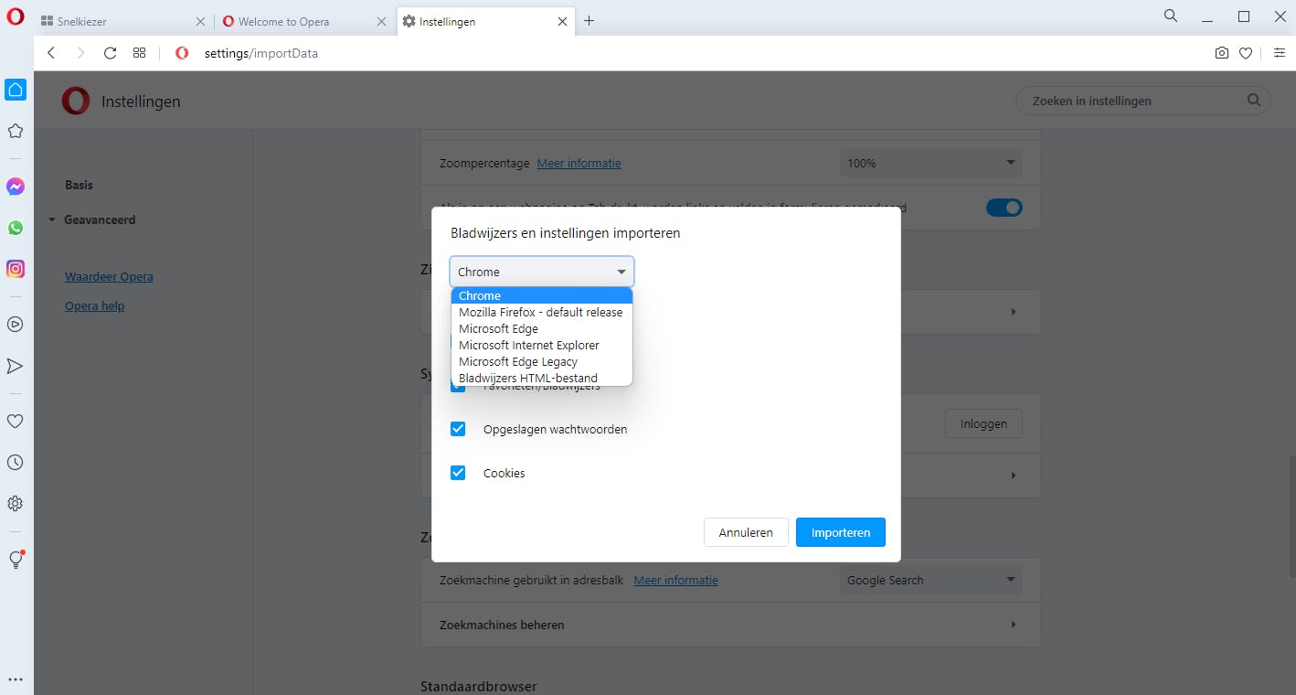 Wil je de iets minder bekende, maar toch populaire browser Opera gaan gebruiken, dan kun je je Favorieten overzetten door in het menu rechtsboven te kiezen voor Ga naar volledige browserinstellingen. Onder Synchronisatie vind je de optie Bladwijzers en instellingen importeren.