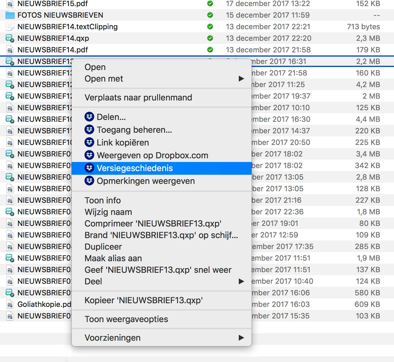 Bij belangrijke projecten hebben sommige gebruikers de gewoonte om de verschillende versies op te slaan van het document waaraan ze werken, bijvoorbeeld rapport-v1.doc en daaronder rapport-v2.doc enzovoort. Deze paranoia-kopieën – kopieën die je maakt uit angst om iets te verliezen – kunnen behoorlijk in aantal oplopen. Wanneer je bijvoorbeeld werkt aan een Word-bestand (maar dat kan ook ieder ander bestand zijn), creëer je een extra veiligheid door het op te slaan in de Dropbox-map die gesynchroniseerd wordt. Je maakt dan ‘stiekem’ gelijk gebruik van de functie Versiegeschiedenis. Dankzij deze functionaliteit bewaart Dropbox snapshots van alle documenten.