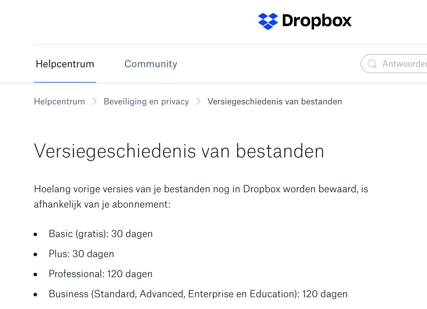 Hoelang Dropbox de verschillende versies bewaart, is afhankelijk van het abonnement dat je hebt. Voor een gratis abonnement (Basic) is dat 30 dagen. Ook een Plus-abonnement bewaart van 30 dagen de bewerkte versies. Heb je een duurder abonnement, Professional of Business, dan wordt een versiegeschiedenis van 120 dagen gegarandeerd. Deze functie heeft overigens géén invloed op het opslagquotum dat hoort bij je abonnement. Het is dus niet zo dat de beschikbare vrije opslagruimte afneemt doordat er meerdere versies van een document worden bewaard.