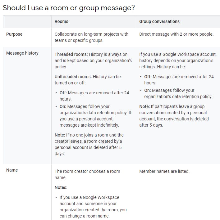 Kies je voor een chatruimte aanmaken, dan geef je een naam voor de groep op en voeg je de contactpersonen toe aan het gesprek. Uiteindelijk lijken de reguliere groepsgesprekken overigens in sterke mate op de gesprekken die je hebt in chatruimtes. Er zijn slechts wat kleine verschillen, waaronder de mogelijkheid om de namen van leden in de groep aan te passen. Google heeft de verschillen tussen ruimtes en groepsgesprekken hier op een rijtje gezet.