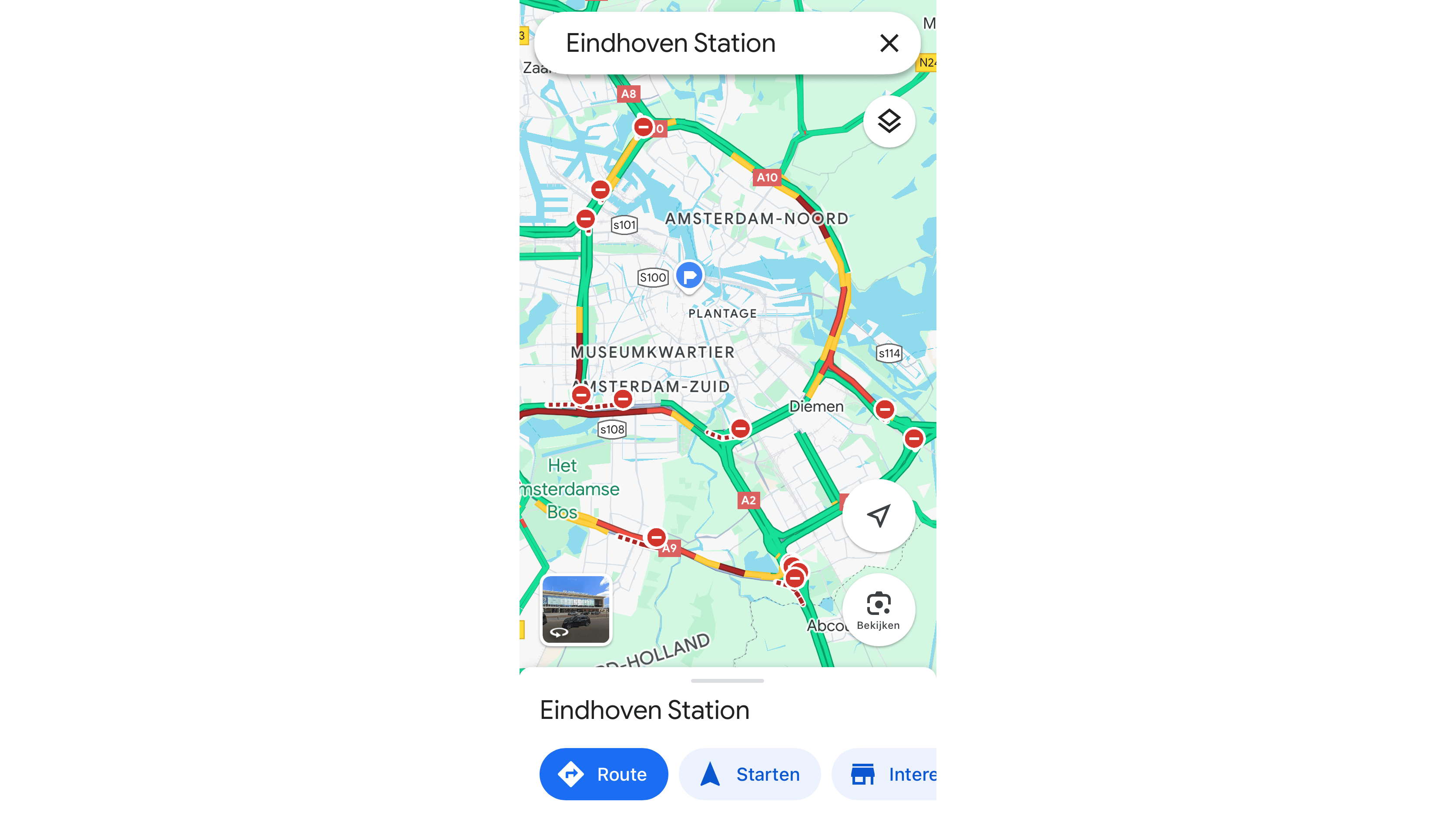 Open Google Maps op je smartphone en geef het vertrekpunt en de bestemming in. Daarna tik je onderaan op Route. Boven de kaart kies je de manier hoe je je verplaatst: auto, tram, metro, te voet of per fiets. Onderaan de kaart lees je alvast de afstand en de reistijd. Tik daarna op het pictogram Lagen in de rechterbovenhoek van het scherm. In de groep Kaartgegevens selecteer je Verkeer. Hierdoor wordt de verkeerslaag over de Google Maps-kaart gelegd. Verlaat het gedeelte Lagen door op het kruisje in de rechterbovenhoek te tikken.