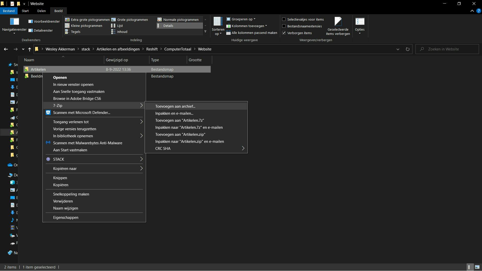 Heb je het programma geïnstalleerd? Dan kunnen we verder in deze how-to. Open nu de Verkenner en selecteer bestanden of een map die je wil verpakken in een zip-bestand. Selecteer hetgeen je wil verpakken en druk vervolgens op de selectie met je rechtermuisknop.