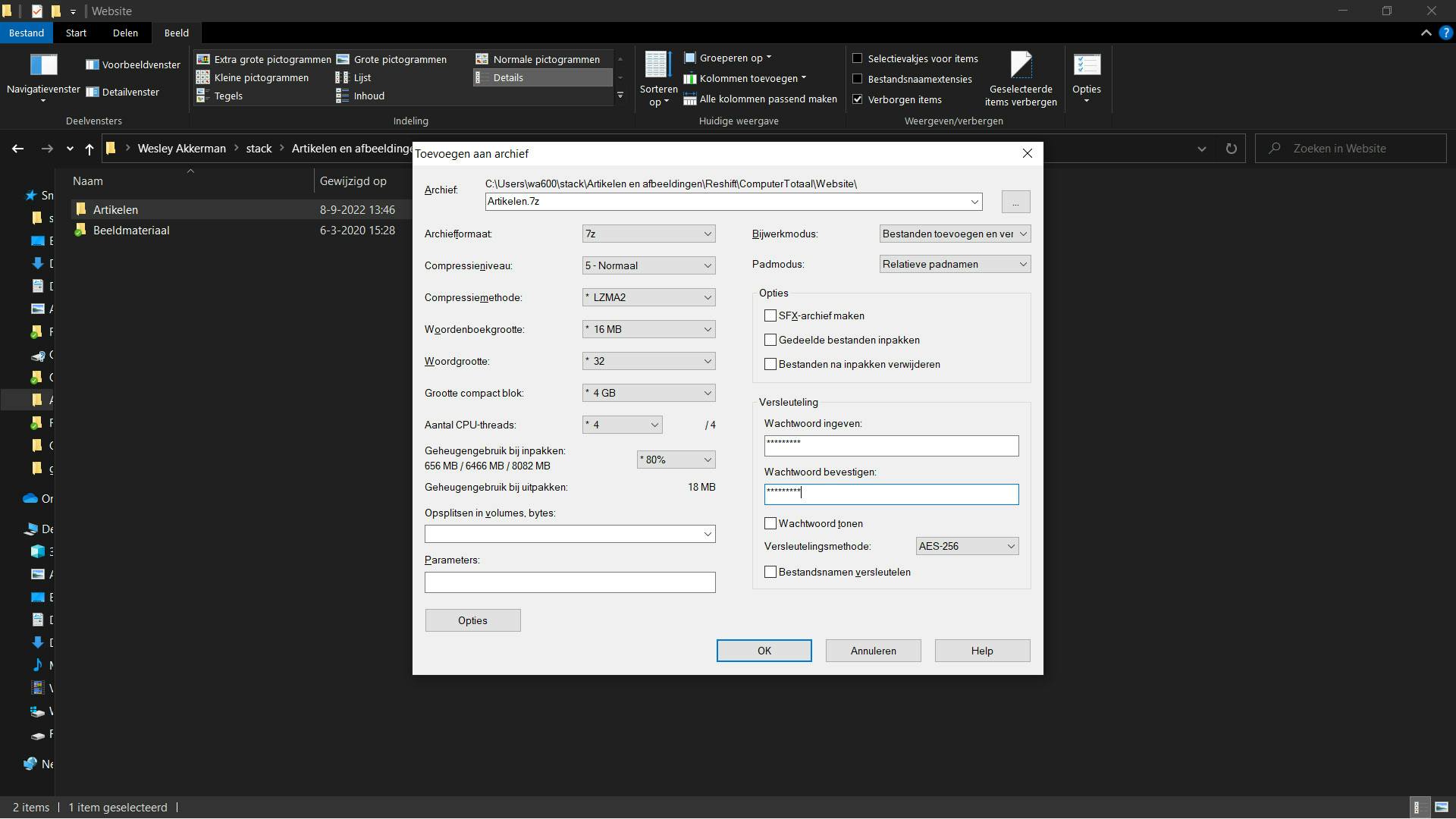 Vervolgens is het zaak om naar de Versleutelingsmethode te kijken. Die optie staat dan weer onder Wachtwoord bevestigen, en het vakje Wachtwoord tonen. Standaard staat die (op moment van schrijven) op AES-256. Is dat niet het geval, kies dan voor deze optie. Dit is een zeer populaire en secure methode om je bestanden veilige te houden; onder meer banken en slimme deursloten maken gebruik van dezelfde soort versleuteling.