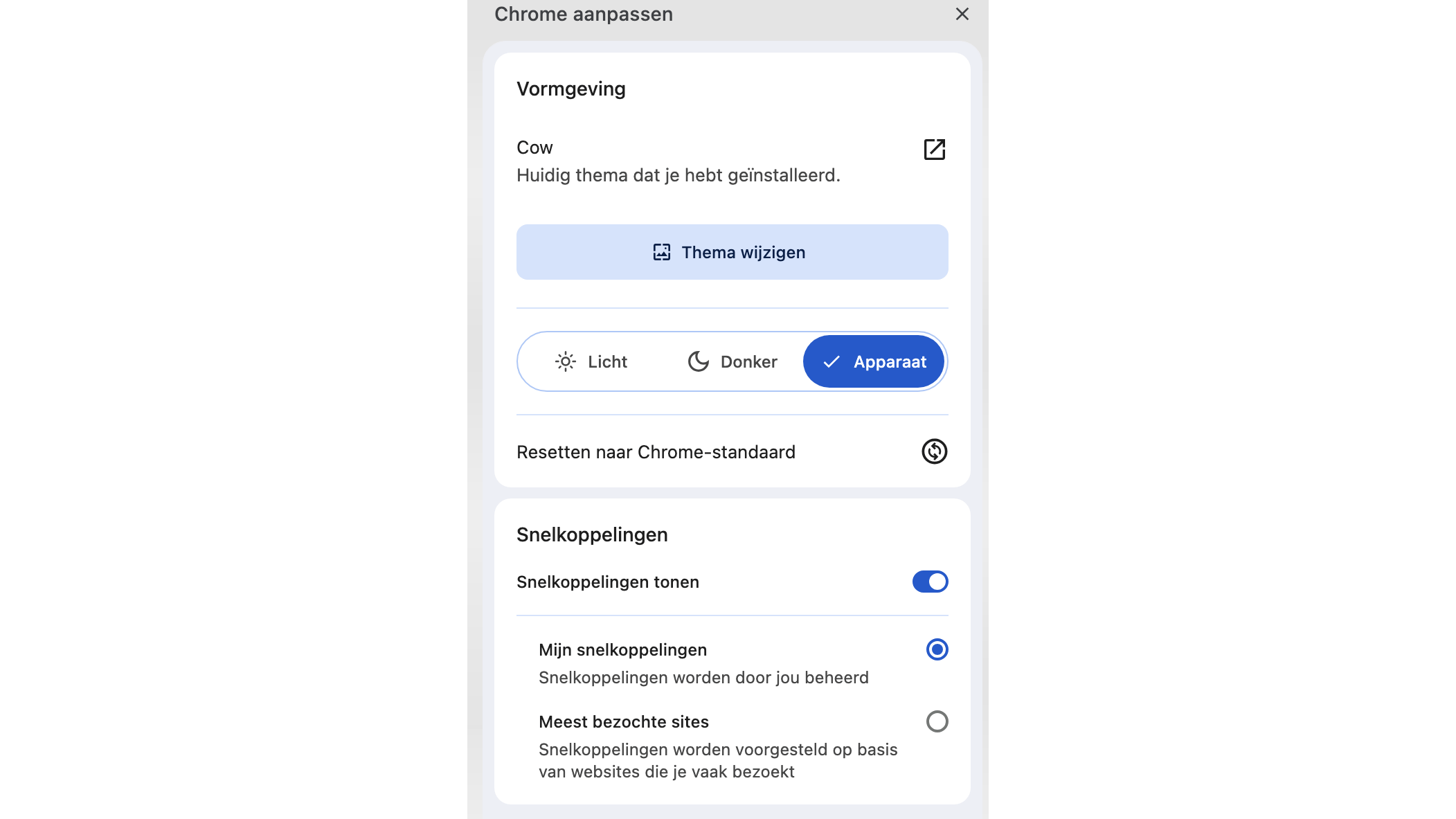 Je kunt ook op de knop Bewerken klikken. Dat is het pictogram van het potlood in de rechterbenedenhoek van een nieuw tabblad. Dan kun je nog een ander thema kiezen, of alsnog de donkere of lichte weergave selecteren. Wanneer je een nieuw thema selecteert, wordt het oude thema vervangen.