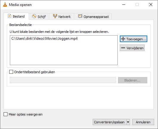 VLC is een freeware mediaspeler die eigenlijk op geen enkele computer mag ontbreken, al was het alleen omdat dit programma zo veel verschillende soorten video kan afspelen. De officiële downloadwebsite is: www.videolan.org/vlc. Open het programma en klik in het menu op Media / Converteren/opslaan. In het volgende scherm kies je Toevoegen en navigeer je naar het videobestand waarvan je het geluid wilt verwijderen. In ons geval staat het bestand in de map Video’s. Selecteer het en klik op Openen.