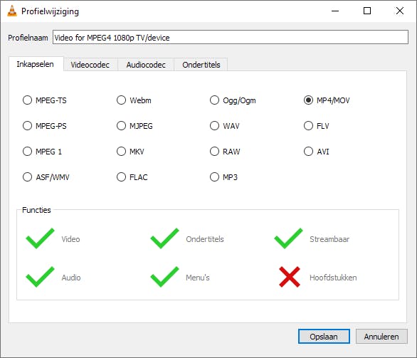 Nu het bestand geopend is, is het tijd om de audio van de video te scheiden. Klik nogmaals op Converteren/opslaan. Hierdoor zal VLC het venster voor de videoconversie openen. In het Converteer-venster moet je onderaan een profiel kiezen. Selecteer een geschikte Output-modus en klik dan op de knop met de moersleutel: Geselecteerde profiel bewerken. In het dialoogvenster dat volgt, is er een overvloed aan opties beschikbaar. Gebruik het tabblad Inkapselen en selecteer daar een videocontainer naar keuze. Wij kiezen voor MP4/MOV omdat we een mp4-video als resultaat willen.