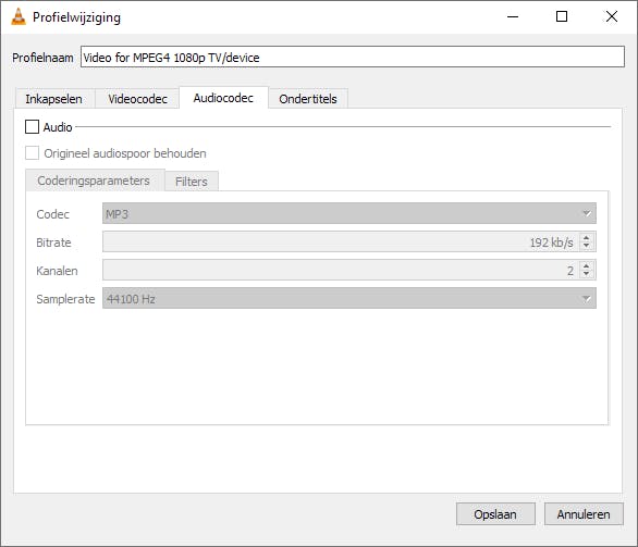 Klik vervolgens op het tweede tabblad: Videocodec. In dit tabblad zet je een vinkje bij Origineel videospoor behouden. Daarna open je het tabblad Audiocodec. Zorg ervoor dat de optie Audio niet is aangevinkt. Klik tot slot op de knop Opslaan om alle instellingen te bewaren.