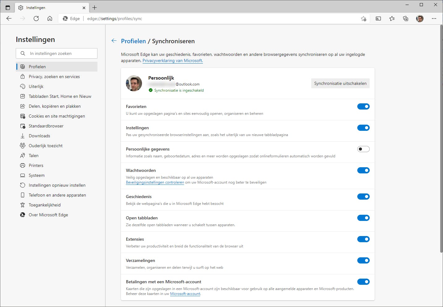 Je bepaalt zelf welke gegevens je wel en niet met andere apparaten uitwisselt. Typ in de adresbalk edge://settings/profiles/sync en druk op Enter. Deactiveer de schakelaar achter de onderdelen die je niet wilt synchroniseren.