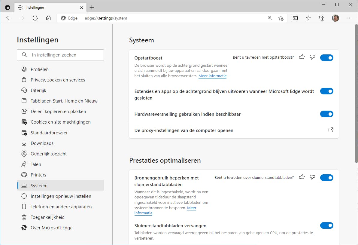 Verder is de optie Bronnengebruik beperken met sluimerstandtabbladen interessant. Hiermee zet Edge inactieve tabs in de slaapstand, zodat ze minder processorkracht en werkgeheugen opeisen. Controleer ten slotte of de optie (mits aanwezig) Hardwareversnelling gebruiken indien beschikbaar is ingeschakeld.