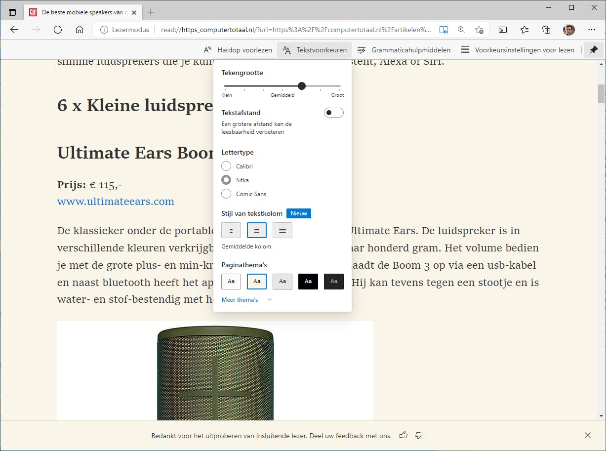 Klik hiervoor aan de rechterkant van de adresbalk op het pictogram met de boek en luidspreker. Als alternatief kun je ook op F9 drukken. Je concentreert je nu volledig op de tekst, want alle opsmuk van de website is verdwenen.