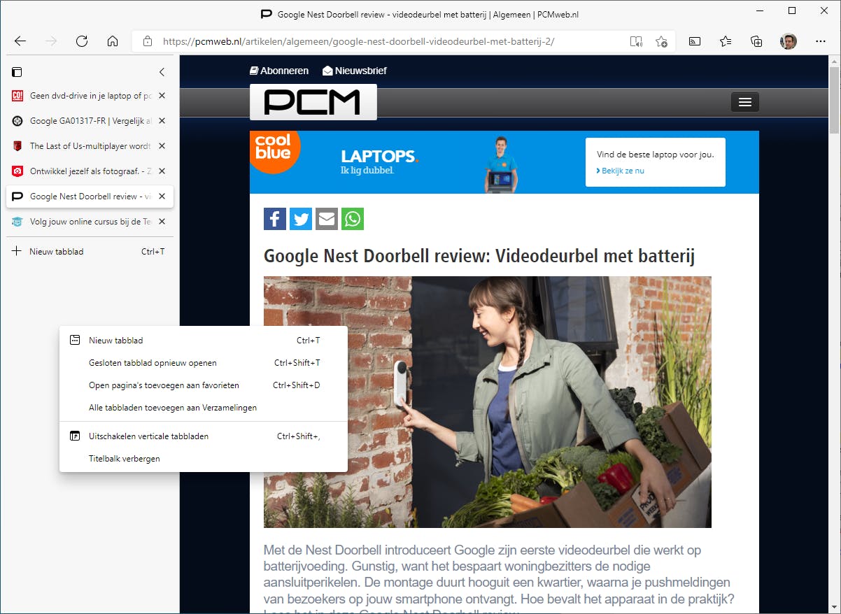 Je kunt hiervoor ook de sneltoets Ctrl+Shift+, (Ctrl+Shift+komma) gebruiken. Er verschijnt nu aan de linkerkant een kolom met alle openstaande websites. Daarnaast kun je ook nieuwe tabs openen. Wil je weer terug naar de oorspronkelijke indeling? Klik met de rechtermuisknop ergens binnen de linkerkolom en kies Uitschakelen verticale tabbladen.