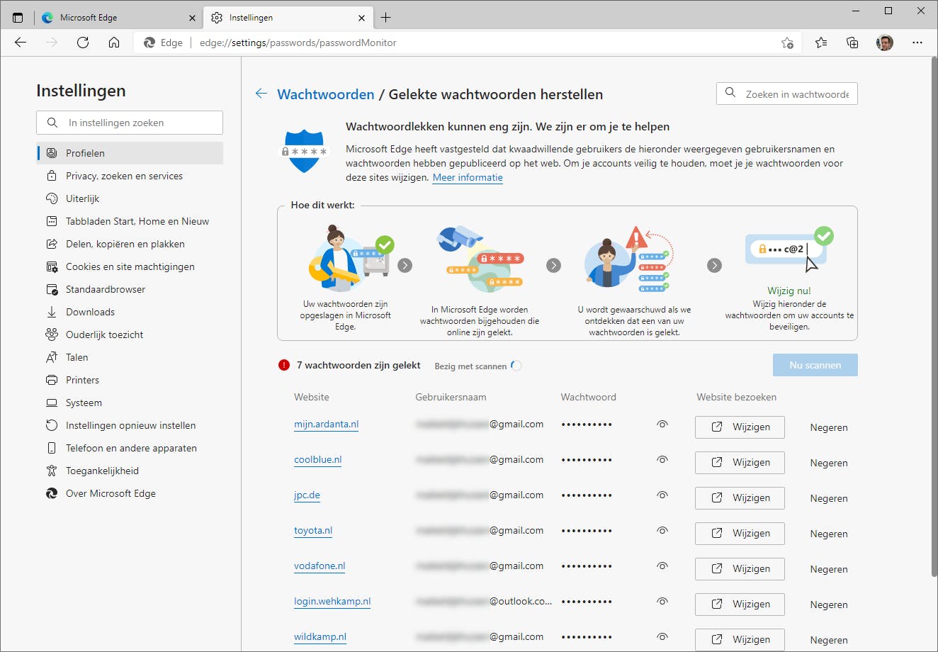 Ga in Edge naar Instellingen en meer / Instellingen / Wachtwoorden en schakel de optie Meldingen weergeven wanneer er wachtwoorden zijn gevonden in een online lek in. Typ vervolgens in de adresbalk edge://settings/passwords/passwordMonitor en druk op Enter. Via Nu scannen ontdek je welke (gelekte) wachtwoorden een veiligheidsrisico vormen. Het advies is om de inloggegevens van deze accounts te wijzigen.