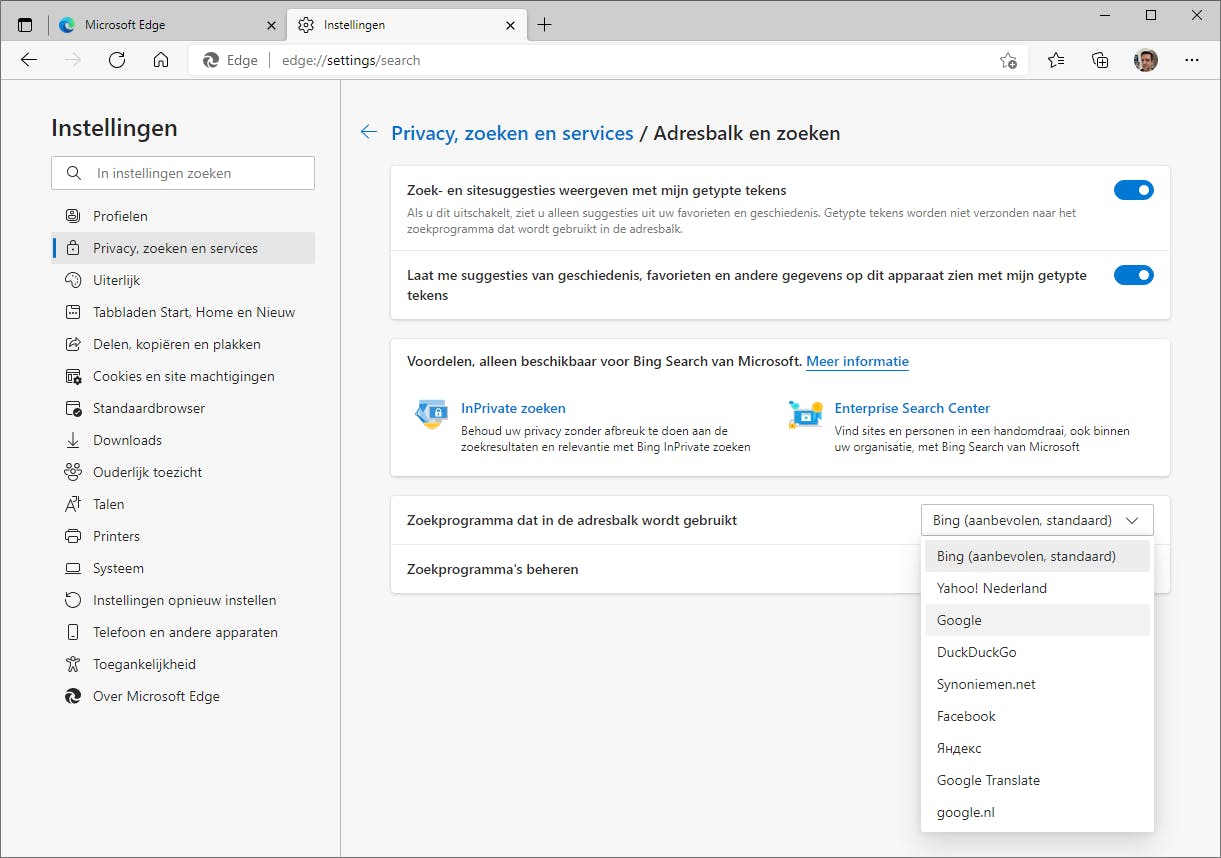 Vanzelfsprekend gebruik je de adresbalk van Edge om naar websites te surfen. Je kunt met de adresbalk ook rechtstreeks op internet zoeken. Typ maar eens één of meerdere trefwoorden en druk daarna op Enter. Er verschijnt een pagina van Bing met zoekresultaten. Dit is de standaardzoekmachine van Edge, maar misschien zoek je liever met behulp van Google of het privacyvriendelijke DuckDuckGo op internet. Wijzig in dat geval de standaardzoekmachine.