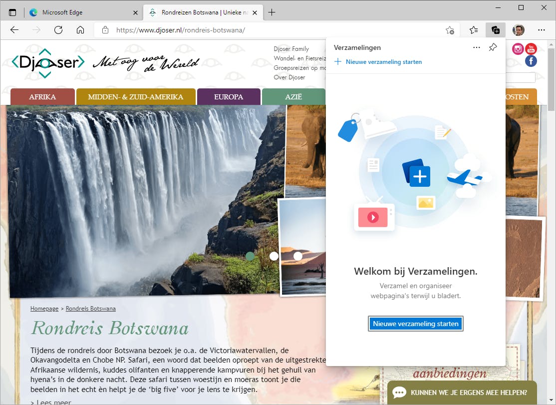 Je kunt met Edge verzamelingen aanleggen van specifieke webinhoud en die vervolgens met je smartphone delen. Bundel op die manier voorkennis over jouw droomreis of informatie over een nieuwe keuken. Als je een webpagina wilt opslaan, klik je aan de rechterkant van de adresbalk op Verzamelingen (pictogram met vierkant en plusteken). Kies nu Nieuwe verzameling starten en typ een logische onderwerpnaam. Je klikt als laatste op Huidige pagina toevoegen.