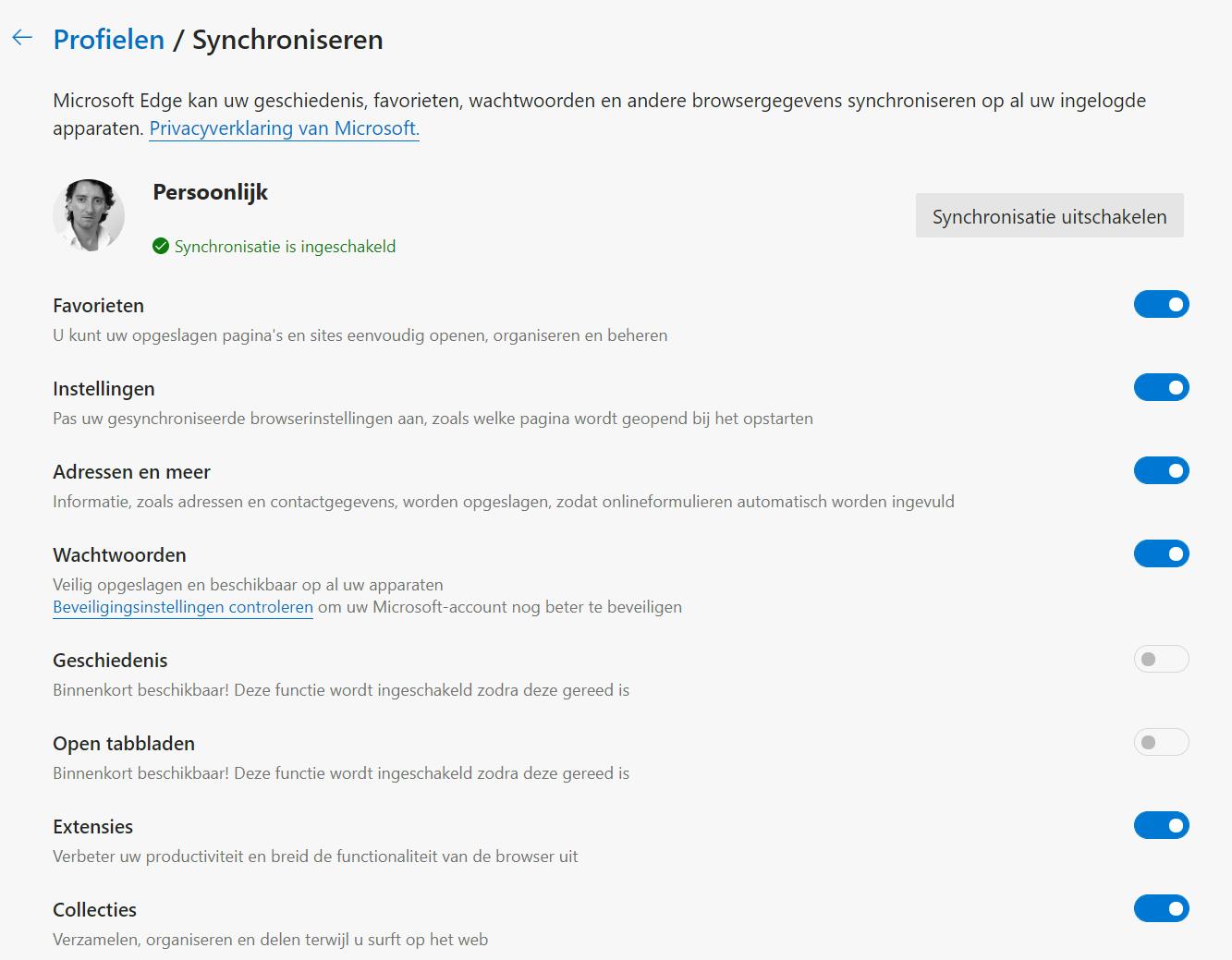 Ben je aan de slag gegaan met collecties? Kies dan voor Collecties, zodat deze ook op alle apparaten beschikbaar zijn. Op dit moment werken de makers nog aan de optie om de internetgeschiedenis en geopende tabbladen te synchroniseren. Deze opties zijn al zichtbaar in het venster: zodra ze beschikbaar zijn, kun je ze activeren.