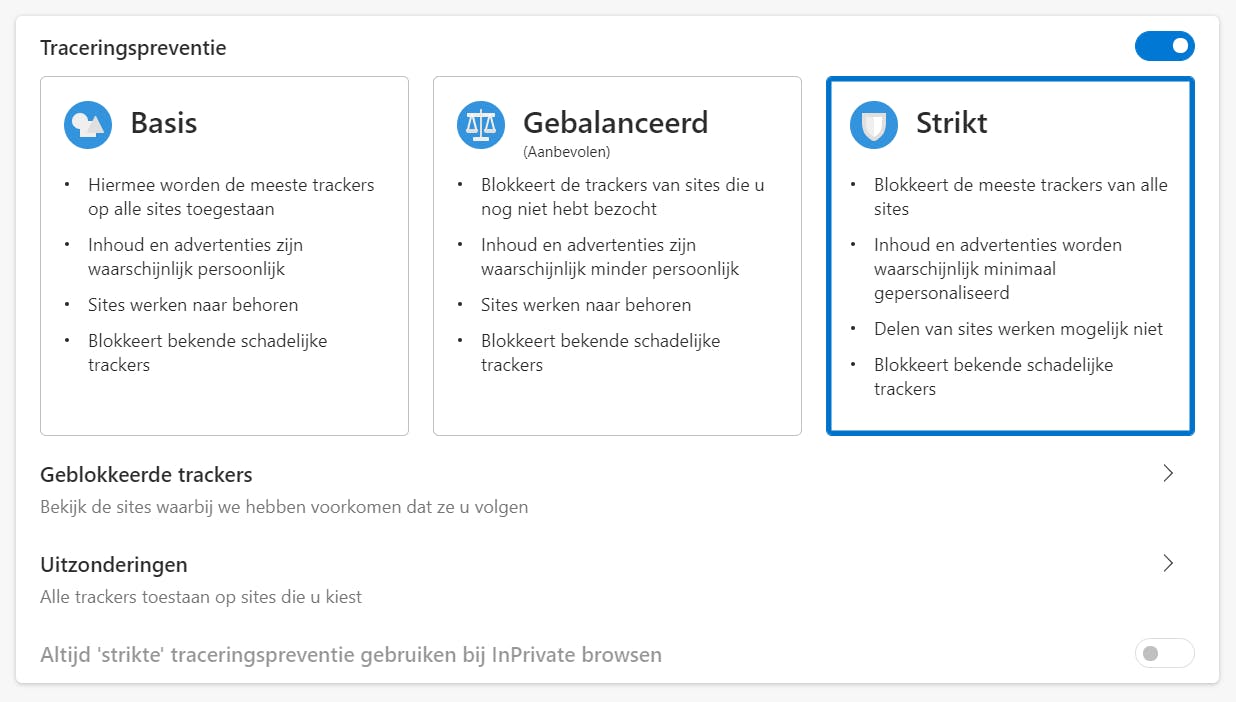 Edge maakt onderscheid in drie beschermingsniveaus: Basis, Gebalanceerd en Strikt. Wij kiezen voor de laatste. Hiermee worden de meeste trackers geblokkeerd en word je niet meer lastiggevallen door gepersonaliseerde advertenties. Sommige websites werken alleen niet meer naar behoren bij deze bescherming. Merk je dit op, maak dan gebruik van de optie om een uitzondering te maken. Klik op Uitzonderingen en kies voor Website toevoegen. Geef het internetadres op en kies Toevoegen. De website werkt hierna weer zoals het hoort.