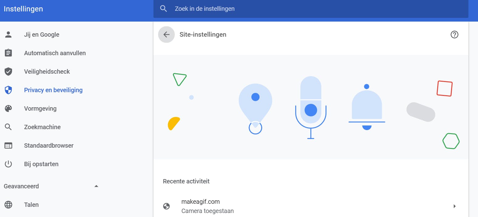 Open het instellingenvenster door te klikken op Google Chrome aanpassen en beheren. De knop is herkenbaar aan de drie puntjes en bevindt zich rechtsboven in het venster. In het instellingenvenster kies je Privacy en beveiliging. Klik op Site-instellingen. Bij Rechten klik je op het type Machtiging waarvoor je de bijbehorende websites wilt zien. Klik op het afspeelknopje (rechts van de website) om alle rechten voor een site te bekijken. Wil je de rechten verwijderen, dan klik je op het pictogram van de prullenbak.