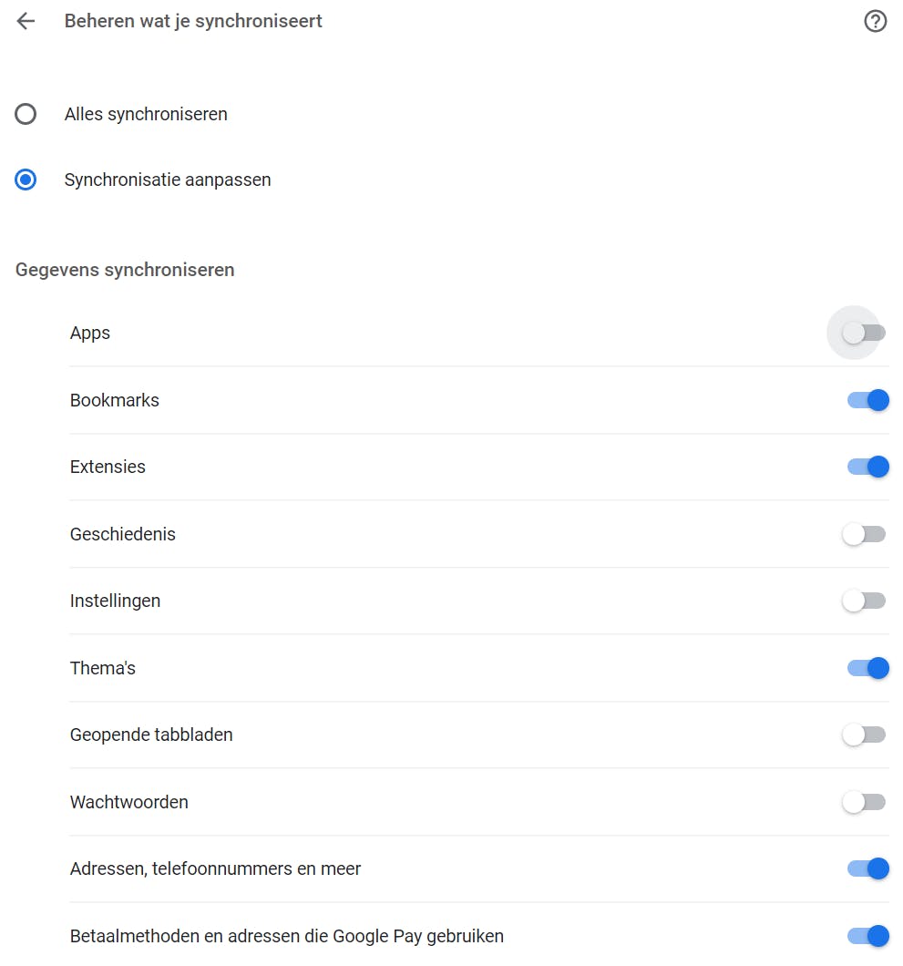 Wil je dat ook de personalisatieopties worden meegenomen, zoals de website die standaard laadt bij het openen van de browser? Dan activeer je ook Instellingen. Ook het synchroniseren van persoonlijke gegevens, zoals adressen en wachtwoorden, is mogelijk. Daarmee worden onder meer formulieren automatisch ingevuld. Kies hiervoor voor Adressen en meer en Wachtwoorden.
