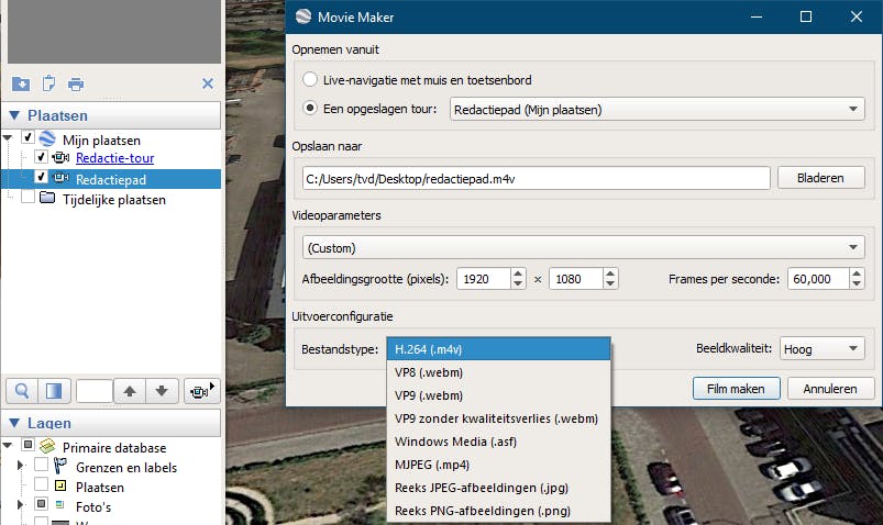 Hoe zet je die opgenomen tour nu om naar een videobestand? Via het menu Extra / Movie Maker – zorg er wel voor dat je het touropnamebalkje eerst afgesloten hebt! Er verschijnt een dialoogvenster waarin je allerlei parameters voor je video in kunt stellen. Dat gaat van QVGA (320x240) tot UHD (3840x2160), maar ook Custom is mogelijk, zodat je zelf de Afbeeldingsgrootte en het aantal Frames per seconde kunt instellen. Verder duid je de gewenste Beeldkwaliteit en het Bestandstype aan, zoals H.264 (.m4v), VP9 (.webm) of MJPEG (.mp4). Bovenaan kies je tussen Een opgeslagen tour (die je dan terugvindt bij Mijn plaatsen) en Live-navigatie met muis en toetsenbord. Je start de opname met Film maken, een proces dat wel even kan duren. Bekijk het resultaat met een gratis tool als VLC Media Player.