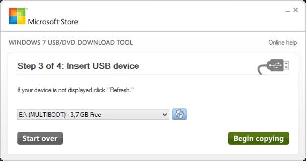 Nu gebruiken we het iso-bestand voor een opstartbare usb-stick. Download het programmaatje Windows 7 USB/DVD Download Tool en installeer dit. Open het programma en kies bij Source file voor Browse. Zoek vervolgens het zojuist-gedownloade iso-bestand en druk op Openen en Next. Plaats vervolgens een usb-stick (minimaal 4 GB) in de pc, waar geen bestanden meer op staan die je nog nodig hebt. Klik op USB device en Begin copying. Bevestig ten slotte dat je alle gegevens op de stick wilt verwijderen en de opstartbare usb-stick wordt gemaakt.