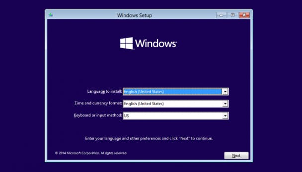 Plaats de usb-stick en start je pc op. Als je pc vanaf de usb-stick opstart, krijg je na een laadperiode een Windows Setup-venster te zien. Laat de taal op Engels staan (een Nederlandse versie is helaas nog niet beschikbaar). Wel kun je achter Time and currency format voor Dutch (Netherlands) kiezen. Laat de toetsenbordinstellingen ook staan op United States-International en druk op Next. In het volgende venster kies je Install now, ga akkoord met de licentievoorwaarden en druk weer op Next.