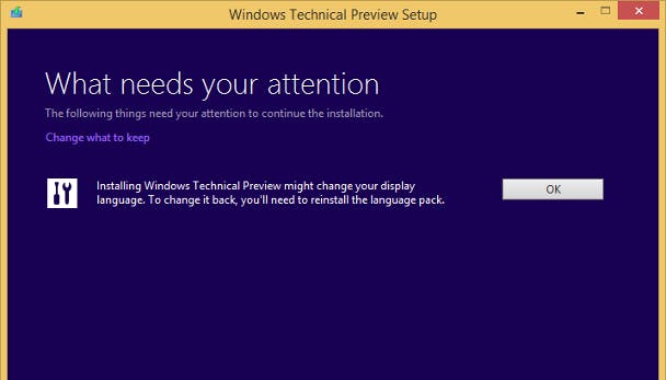Mochten er moeilijkheden of conflicten zijn tussen jouw huidige Windows-versie en het te installeren Windows 10, dan krijg je dit in het venster dat volgt te zien. In ons geval was het enige conflict de andere taal (Windows 10 werkt alleen in het Engels, terwijl onze Windows 8.1-installatie Nederlandstalig was). Druk op Ok en Install om de installatie echt te starten. Je ziet een tellertje oplopen en de pc start meerdere malen opnieuw op. Let er echter wel op dat de computer bij een herstart niet van de usb-stick start.