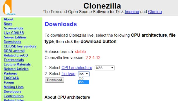 Voor onze kloonoperaties gebruiken wij het gratis CloneZilla, een opensource Linux-distributie. Kennis van Linux is niet nodig. CloneZilla heeft twee varianten: een live-versie en een server-editie. Voor thuisgebruik volstaat de live-versie. Je vindt die hier, waar je de rubriek Downloads opent en Stable releases aanklikt. Met het oog op compatibiliteit (met de meeste x86-cpu's) kies je bij CPU architecture voor i486. Ben je van plan een live-cd te branden, kies dan iso bij File type. Heb je liever een opstartbare usb-stick, selecteer dan zip. Bevestig met Download.